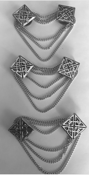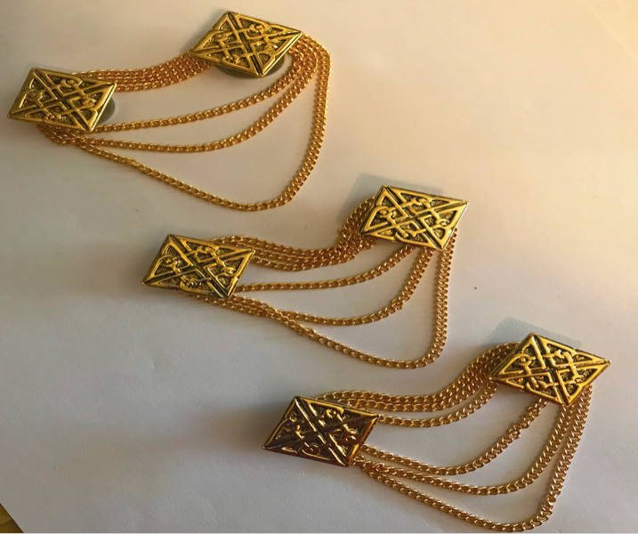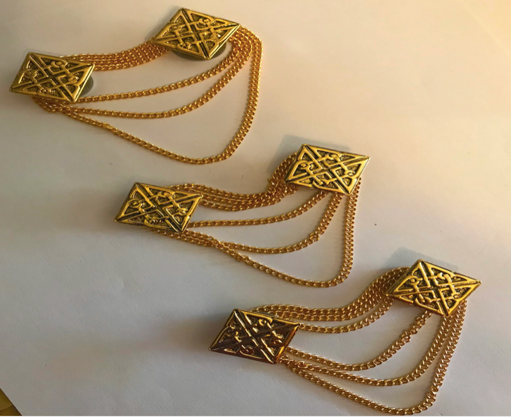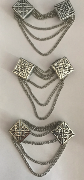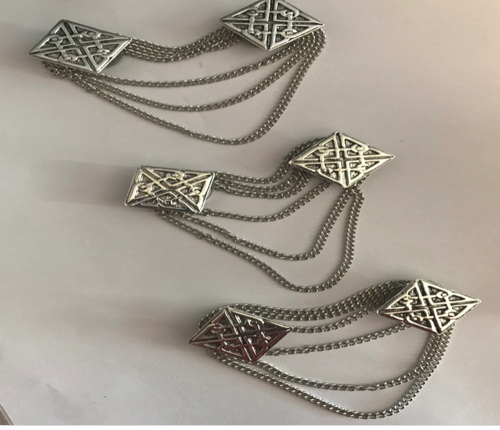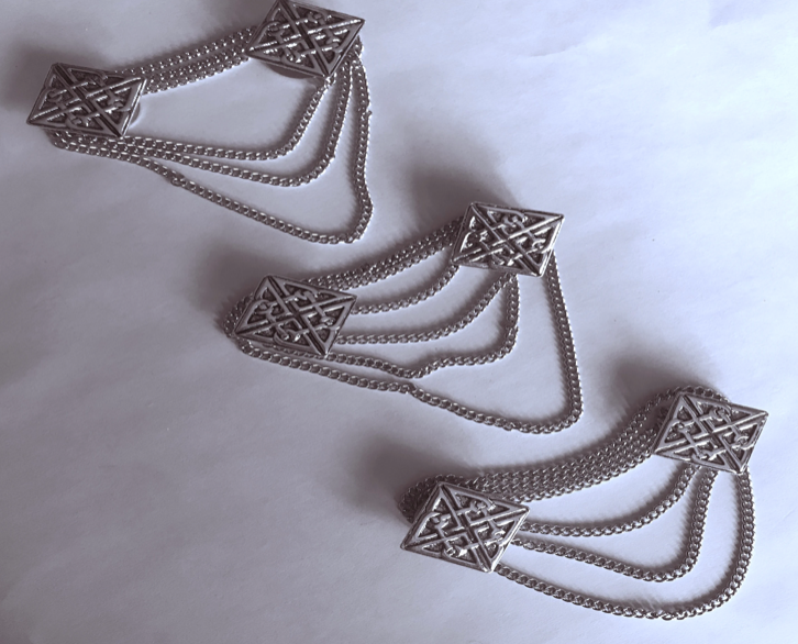 Cloak Clasp - Set of 3 - This Celtic Cloak Clasp is a screw on style fit for any renaissance faire. This cape clasp can be transferred to multiple garments. It comes with the screws and washers and an endless chain which can be wrapped any amount of times depending on how open or closed you would like your garment to be. Available in silver or gold.