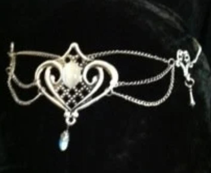 This tiara adds pizzazz to any outfit with its quirky Art Nouveau design and adjustable chain. Wear it as a statement headpiece or as a unique necklace. The cats eye stone in the center adds a touch of elegance.